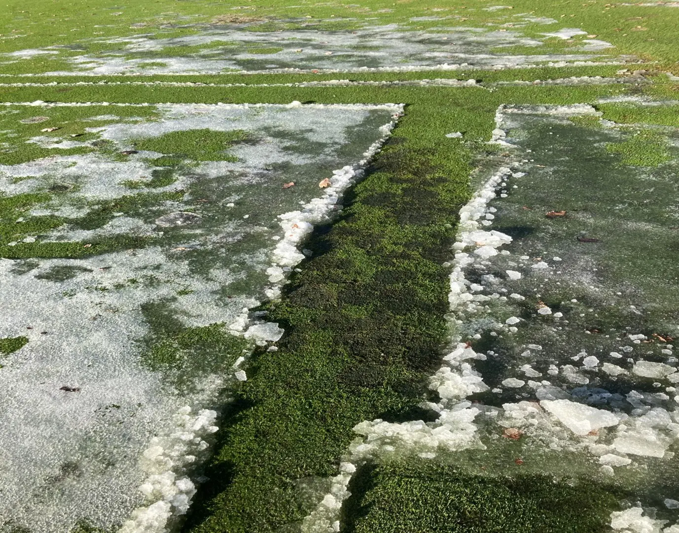 Vi har snömögel på grund av snötäcket och vattnet. Mycket snömögel har uppstått på grund av det instängda vattnet under snötäcket i kombination med den frusna marken och det inte funnits någonstans för vattnet att ta vägen. Våra kallare greener har överlevt bättre än de andra och är relativt sjukdomsfria. Vi har som förväntat hårda skador på vår 11-hålsgreen som kommer att kräva reparationsarbete när möjligheten ges. För tillfället ser resten ut som att de har överlevt vintern. Vi är också ganska nöjda med resultatet för våra nya 4- och 5-hålsgreener.